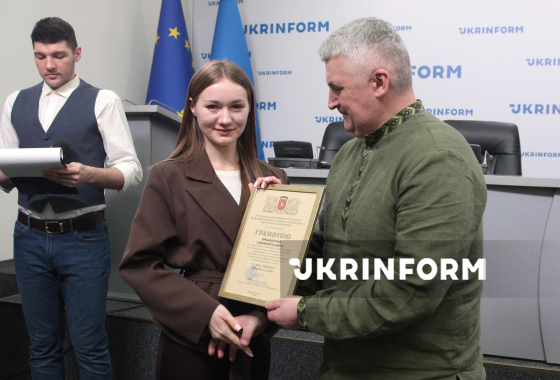 Генеральний директор Укрінформу Сергій Череватий вручає грамоту Військового інституту Київського національного університету ім. Тараса Шевченка Софії Прокопенко під час урочистого заходу з нагоди 108-ї річниці від дня заснування Українського національного інформаційного агентства “Укрінформ”, Київ, 16 березня 2026 року.