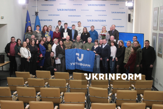 Працівники Укрінформу позують для фото під час урочистого заходу з нагоди 108-ї річниці від дня заснування Українського національного інформаційного агентства “Укрінформ”, Київ, 16 березня 2026 року.