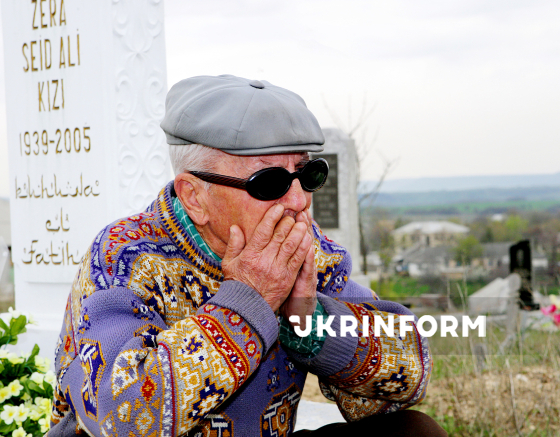 Кримський татарин оплакує понівечену могилу родича на сплюндрованому мусульманському кладовищі, Сімферополь, АР Крим, 11 квітня 2008 року. Фото Арвідаса Шеметаса.