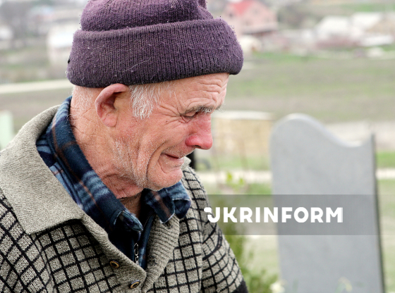 Кримський татарин молиться та оплакує понівечену могилу родича на сплюндрованому мусульманському кладовищі, Сімферополь, АР Крим, 11 квітня 2008 року. Фото Арвідаса Шеметаса.