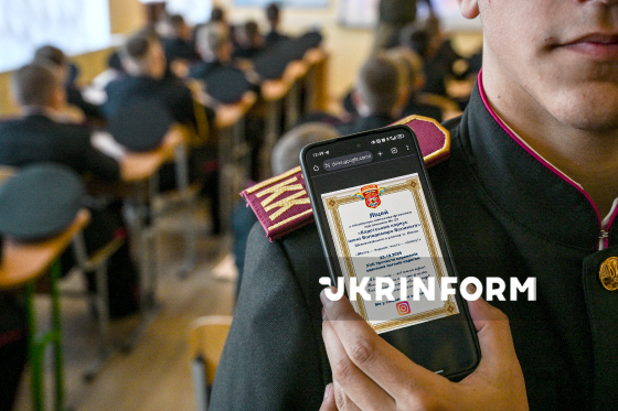 Вихованці ліцею-інтернату з посиленою військово-фізичною підготовкою №23 “Кадетський корпус імені Володимира Великого”, які отримали погони з NFC-технологією, сидять за партами під час уроку з кадетознавства, Київ, 3 листопада 2025 року. У межах експериментального ходу у погони вмонтовано чіп, що містить базову інформацію про навчальний заклад, метадані про учня і, символічно — слова “Клятви кадета”, які промовляються під час посвяти.