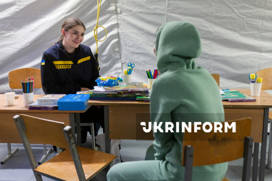 Дівчина спілкується з психологом ДСНС у мобільному наметі ДСНС, розгорнутому через складну ситуацію з електро- та теплопостачанням, спричинену російськими атаками на енергооб`єкти України, у Дніпровському районі столиці, Київ, 6 лютого 2026 року. У ніч на 3 лютого війська РФ атакували Дарницьку ТЕЦ п`ятьма балістичними ракетами. Станція зазнала критичних руйнувань і була зупинена. Понад 1100 житлових будинків у Дніпровському та Дарницькому районах залишилися без теплопостачання.