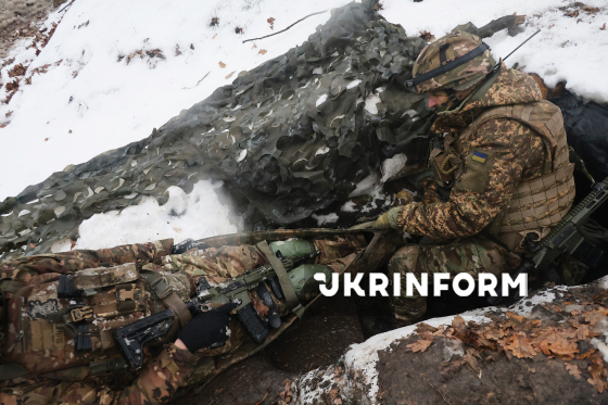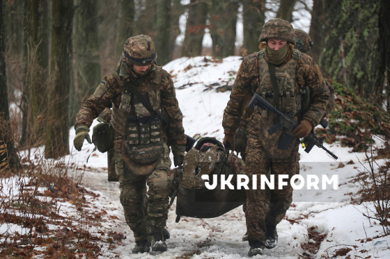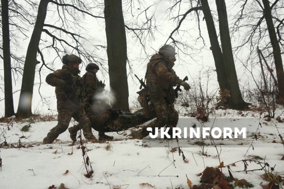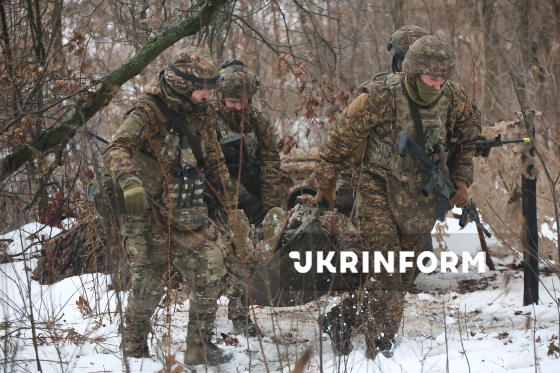 Бійці 13-ї бригади Національної гвардії України “Хартія” переміщають бійця, умовного пораненого внаслідок скиду вибухівки з дрона, у бліндаж, де йому нададуть першу допомогу за протоколом MARCH в очікуванні подальшої евакуації, 3 січня 2026 року.