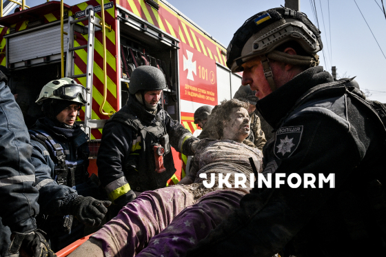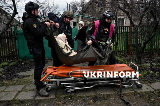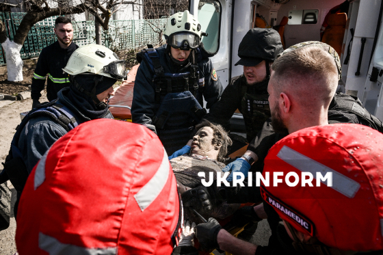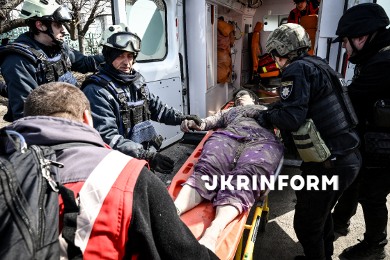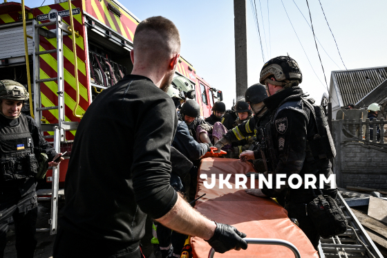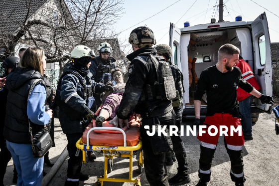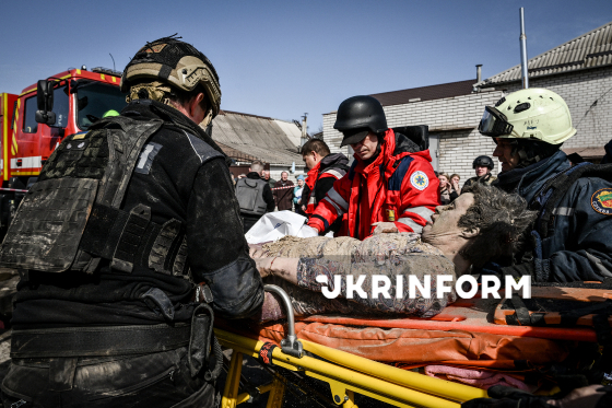 Рятувальники, медики та поліцейські заносять у карету швидкої допомоги поранену жінку, яку деблокували з-під завалів приватного будинку, знищеного внаслідок російського обстрілу дронами приватного сектору, Запоріжжя, 16 березня 2026 року. Російська армія атакувала ударними дронами приватний сектор. Внаслідок обстрілу загинула 68-річна жінка. Також рятувальники дістали з-під завалів житлового будинку поранених дівчину 2010 року народження та жінку-інваліда 1987 року народження.
