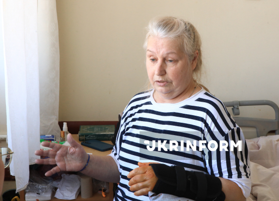 Пацієнтка Лариса показує журналісту травмовану внаслідок падіння руку у палаті відділення травматології Київської міської клінічної лікарні, Київ, 20 лютого 2026 року.