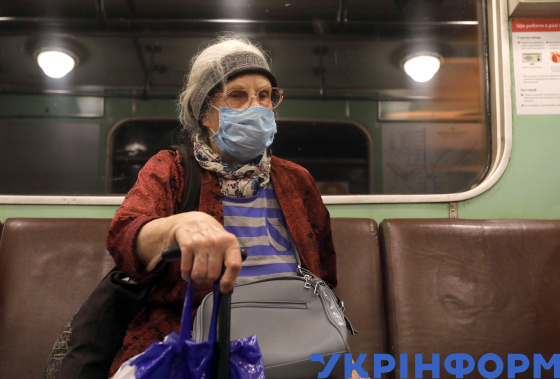 Літня жінка в медичній масці під час карантинних обмежень внаслідок пандемії COVID-19 у вагоні поїзда Київського метрополітену, Київ, 15 червня 2020 року.