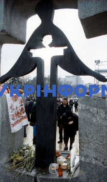 Кияни в День пам’яті жертв голодоморів і політичних репресій біля пам’ятного знака "Жертвам Голодомору 1932-1933 років" на Михайлівській площі, Київ, 26 листопада 2005 року. Фото Олега Диканя.
