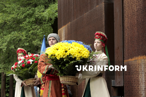 Квіти біля пам’ятника жертвам тоталітаризму 1937-1941 років під час церемонії вшанування пам’яті жертв політичних репресій на території Національного історико-меморіального заповідника "Биківнянські могили", Биківня, Київ, 21 травня 2017 року. Фото Євгена Любімова.