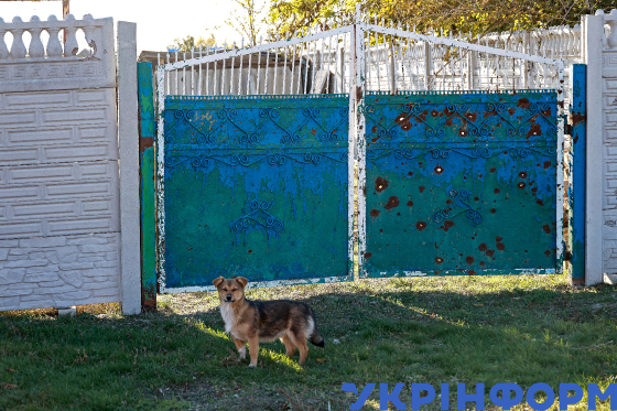 Собака біля пошкодженого внаслідок російських обстрілів паркану, село Посад-Покровське, Херсонська область, 7 листопада 2024 року.