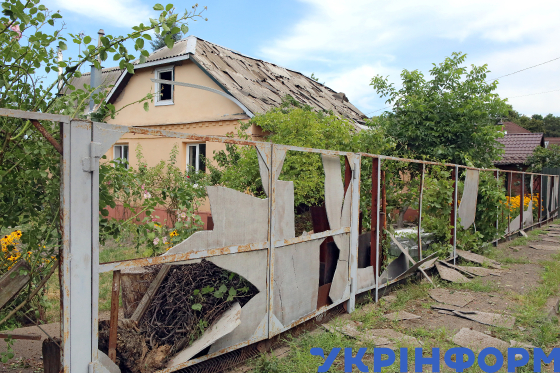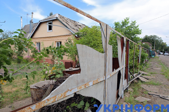 Понівечений внаслідок російського ракетного обстрілу приватний будинок і паркан по вулиці Василя Верховинця у селищі Перемога Святошинського району столиці, Київ, 8 липня 2024 року.