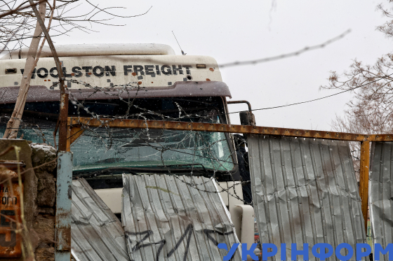 Пошкоджені внаслідок російської дронової атаки паркан та вантажівка, Одеса, 20 лютого 2025 року.