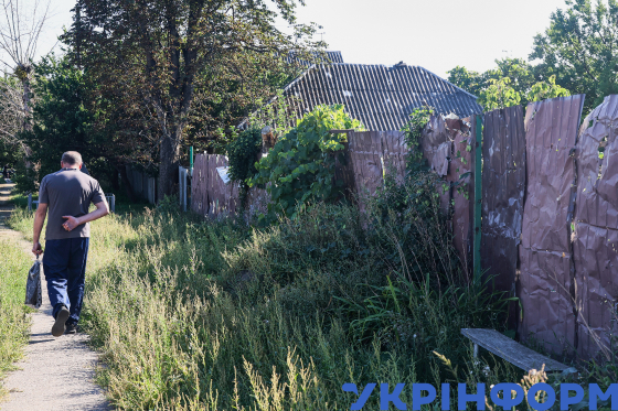 Чоловік проходить повз паркан, понівечений внаслідок російських обстрілів, Дергачі, Харківський район, Харківська область, 3 вересня 2025 року.