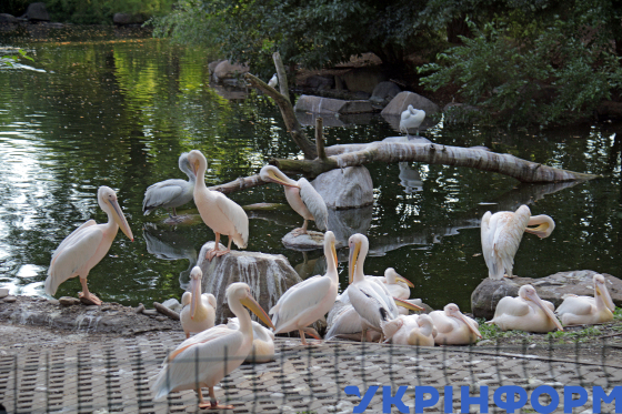 Пелікани рожеві біля водойми на території Київського зоологічного парку, Київ, 29 червня 2024 року.