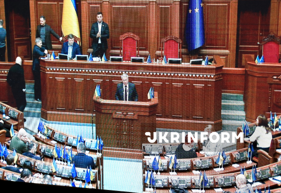 Виступ народного депутата України, членкині депутатської фракції політичної партії "Голос" Інни Совсун з трибуни під час пленарного засідання Верховної Ради України транслюється для представників ЗМІ у пресцентрі парламенту, Київ, 11 лютого 2026 року.