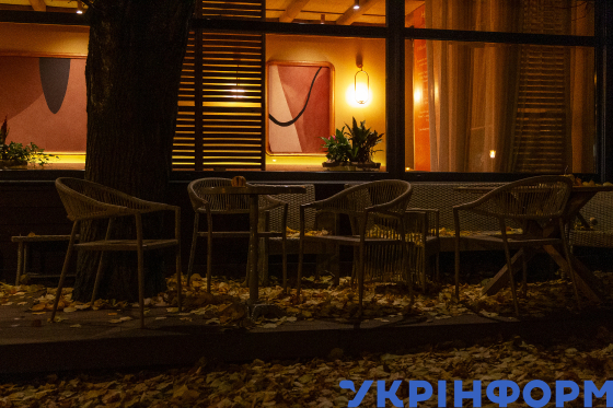 Стільці біля кав’ярні, Київ, 24 жовтня 2025 року. Унаслідок систематичних російських атак на енергетичну інфраструктуру в місті запровадили погодинні графіки відключень світла.