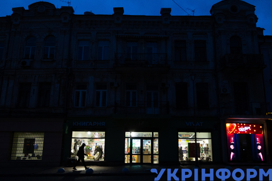 Чоловік проходить повз будівлю книгарні, Київ, 24 жовтня 2025 року. Унаслідок систематичних російських атак на енергетичну інфраструктуру в місті запровадили погодинні графіки відключень світла.