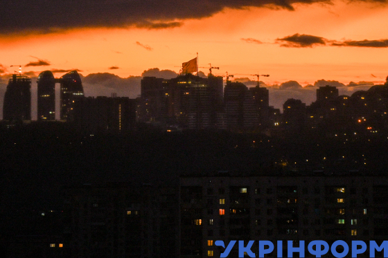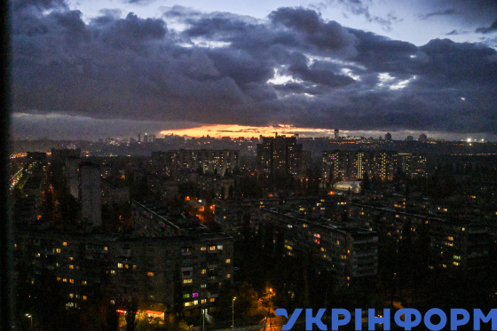 Частково знеструмлені житлові будинки на тлі помаранчевого вечірнього неба, Київ, 29 жовтня 2025 року. У Києві діють погодинні графіки відключення світла через дефіцит електроенергії, спричинений російськими атаками на об’єкти енергосистеми України, а також збільшенням її споживання у холодну погоду.
