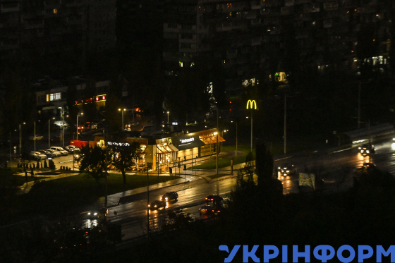 Заклад громадського харчування та прилегла до нього територія підсвічується завдяки альтернативним джерелам живлення посеред знеструмлених через погодинні графіки відключення світла житлових будинків в одному зі спальних районів столиці, Київ, 29 жовтня 2025 року.