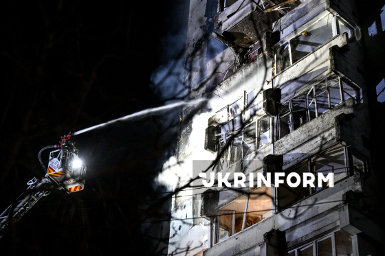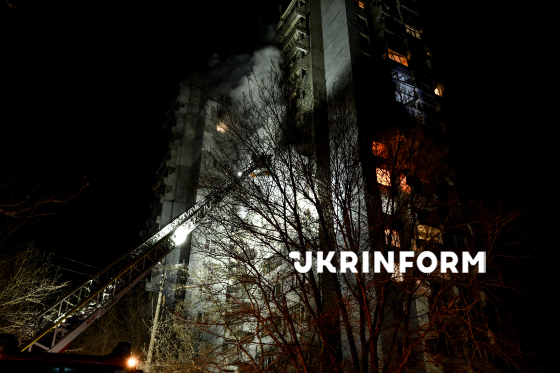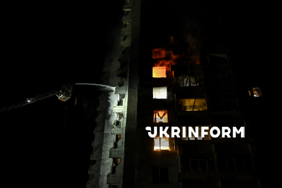 Рятувальники гасять пожежу в одній із квартир багатоповерхового житлового будинку, в яку влучив російський БпЛА, Запоріжжя, 24 березня 2026 року. Вночі російські війська атакували місто ударними дронами та балістичними ракетами. Внаслідок обстрілу одна людина загинула, ще дев`ятеро дістали поранення.