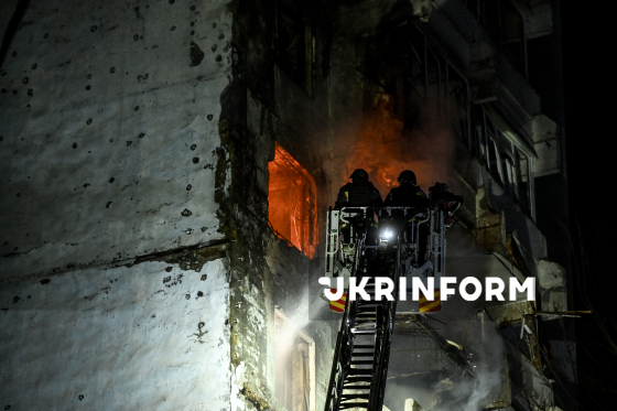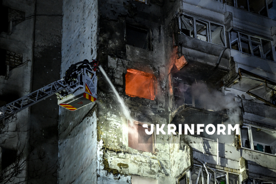 Рятувальник на пожежній драбині ліквідовує наслідки влучання російського БпЛА в будівлю Комунального некомерційного підприємства “Пологовий будинок №5”, Одеса, 28 березня 2026 року. У ніч проти 28 березня російський БпЛА вдарив по пологовому будинку №5, в якому перебували 22 новонароджені дитини, серед них – двійня з критично низькою масою тіла. Завдяки тому, що бомбосховище лікарні обладнане реанімацією для новонароджених, вдалося продовжити вентиляцію у бомбосховищі. Післяопераційних пацієнток перевели в палату інтенсивного нагляду у бомбосховищі. До приїзду рятувальників медики самостійно, за допомогою пожежних рукавів і вогнегасників, ліквідовували пожежі, які виникли в будівлі та на даху пологового. Внаслідок нічної атаки РФ на місто загинули двоє людей, постраждали 12 людей, серед яких – дев`ятирічний хлопчик.