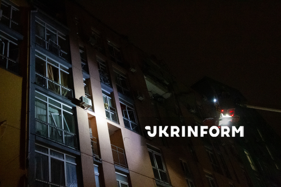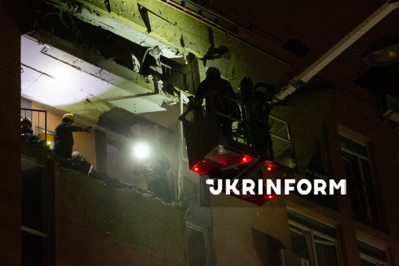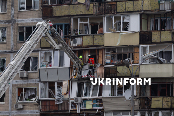 Рятувальники на пожежному підйомнику оглядають балкони у багатоквартирному житловому будинку у Дарницькому районі, який було пошкоджено внаслідок російського комбінованого обстрілу столиці, Київ, 29 листопада 2025 року.