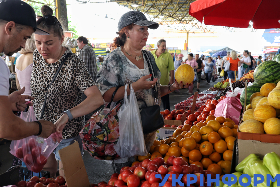 Продавчиня допомагає жінці вибирати овочі на ринку "Столичний", Київ, 12 липня 2025 року.