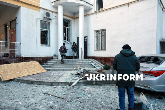 Усипана уламками скла прибудинкова територія після російської атаки БпЛА в одному з районів Одеси, 13 січня 2026 року.