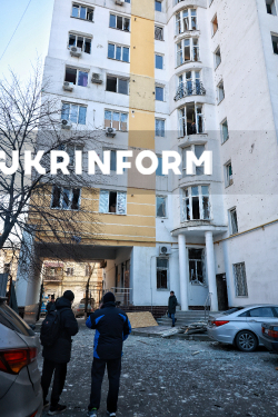 Понівечений внаслідок влучання російського БпЛА п`ятиповерхий житловий будинок у Дніпровському районі столиці, Київ, 3 лютого 2026 року. Внаслідок нічної масованої атаки Росії на об`єкти енергетичної інфраструктури Києва частина лівого берега залишилася без теплопостачання. Найскладніша ситуація – у Дарницькому та Дніпровському районах. Також на лівому березі застосовані екстрені відключення електроенергії.