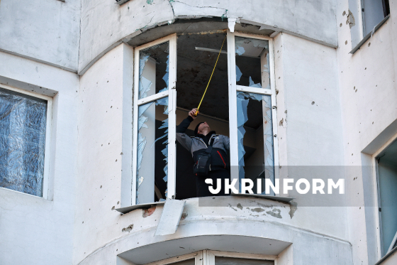 Чоловік вимірює сантиметровою стрічкою висоту потрощеного внаслідок російського обстрілу вікна для закриття його ДСП-дошками, Одеса, 13 січня 2026 року.