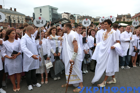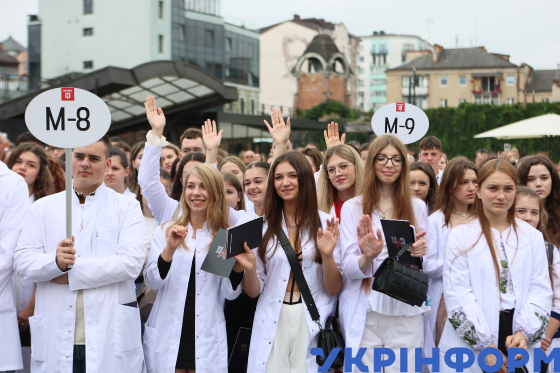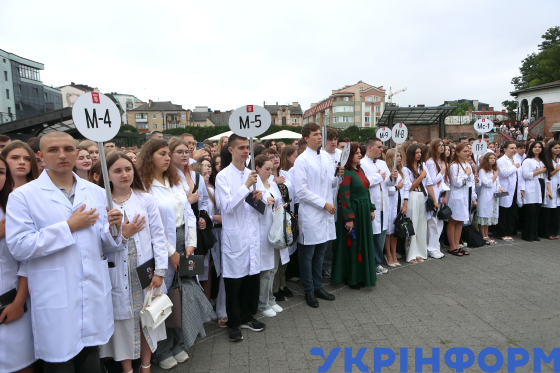 Учасники урочистої церемонії посвяти першокурсників Івано-Франківського національного медичного університету в студенти на території культурно-мистецького простору "Бастіон", Івано-Франківськ, 1 вересня 2025 року.