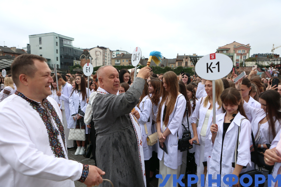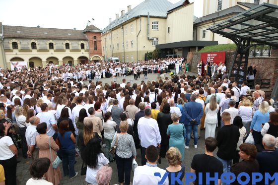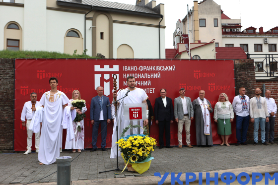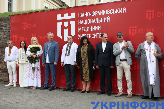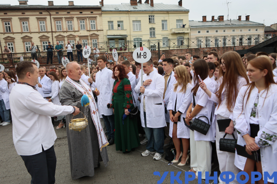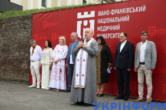 Настоятель Архікатедрального і Митрополичого собору Святого Воскресіння Української Греко-католицької церкви отець Юрій Новіцький, ректор ІФНМУ Роман Яцишин (другий ліворуч) і голова Івано-Франківської ОВА Світлана Онищук (друга ліворуч) під час урочистої церемонії посвяти першокурсників Івано-Франківського національного медичного університету в студенти на території культурно-мистецького простору "Бастіон", Івано-Франківськ, 1 вересня 2025 року.