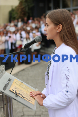 Першокурсниця виступає під час урочистої церемонії посвяти першокурсників Івано-Франківського національного медичного університету в студенти на території культурно-мистецького простору "Бастіон", Івано-Франківськ, 1 вересня 2025 року.