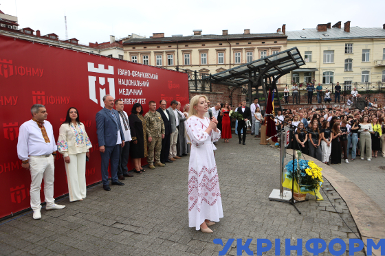 Голова Івано-Франківської ОВА Світлана Онищук вітає присутніх з початком нового навчального року у межах урочистої церемонії посвяти першокурсників Івано-Франківського національного медичного університету в студенти на території культурно-мистецького простору "Бастіон", Івано-Франківськ, 1 вересня 2025 року.