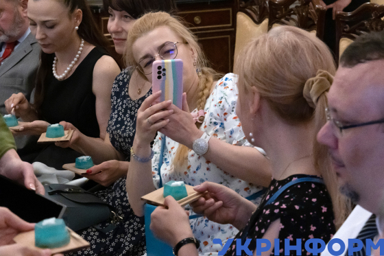 Відвідувачів пригощають японським желейним десертом мідзу-йокан, якому його автори дали поетичну назву "Крила" за віршем Ліни Костенко, під час проведення традиційної японської чайної церемонії, організованої на знак дружби і взаємоповаги між народами Японії та України у резиденції посла Японії, Київ, 25 травня 2024 року.