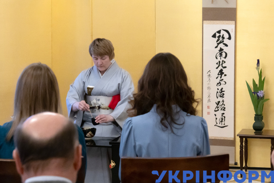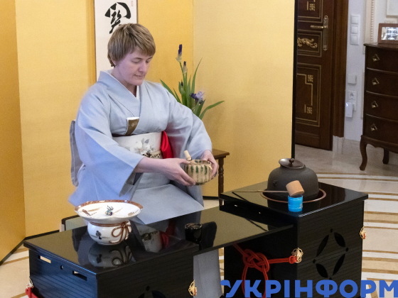 Викладачка чайного дійства в Українсько-японському центрі КПІ ім. Ігоря Сікорського Тетяна Глотова проводить традиційну японську чайну церемонію у резиденції посла Японії, організовану на знак дружби і взаємоповаги між народами Японії та України, Київ, 25 травня 2024 року.