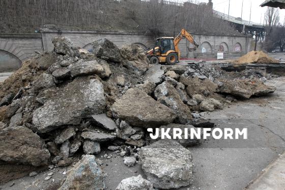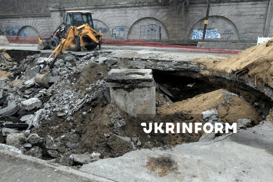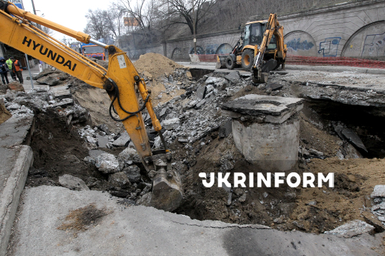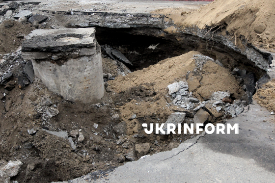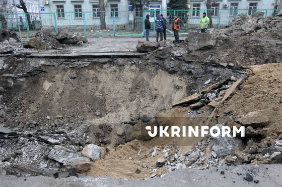 Провалля ґрунту на вулиці Пастера, що утворилося внаслідок пошкодження магістрального водоводу, Дніпро, 4 березня 2026 року.