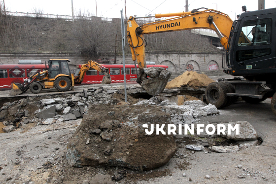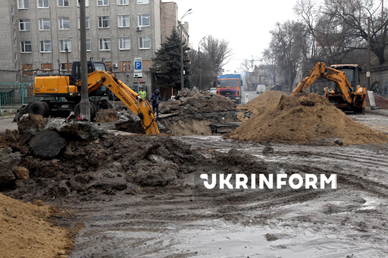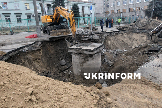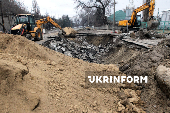 Комунальники проводять аварійно-відновлювальні роботи на місці провалля ґрунту на вулиці Пастера, що утворилося внаслідок пошкодження магістрального водоводу, Дніпро, 4 березня 2026 року.