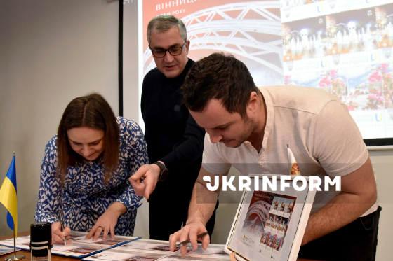 Заступник Вінницького міського голови Владислав Скальський (ліворуч), директорка з розвитку мережи Вінницького регіону АТ "Укрпошта" Оксана Шабанова та вінницький фотограф Валентин Порохняк, світлини якого стали основою для ексклюзивного вінницького поштового блоку, беруть участь в урочистій церемонії спецпогашення нової поштової марки серії "Міста ідей" - "Вінниця наДихає. Пори року" - у турхабі Visit Vinnytsia, Вінниця, 17 грудня 2025 року.