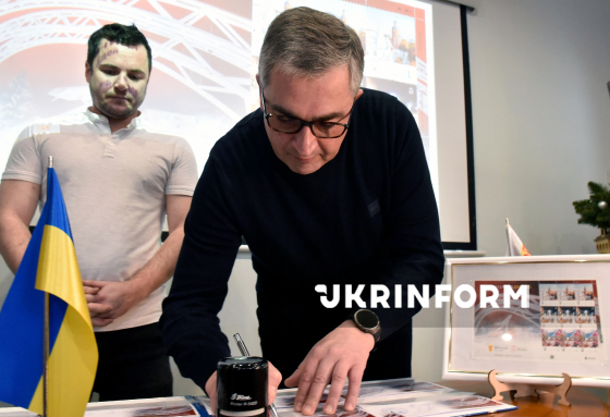 Заступник Вінницького міського голови Владислав Скальський (праворуч) і вінницький фотограф Валентин Порохняк, світлини якого стали основою для ексклюзивного вінницького поштового блоку, беруть участь в урочистій церемонії спецпогашення нової поштової марки серії "Міста ідей" - "Вінниця наДихає. Пори року" - у турхабі Visit Vinnytsia, Вінниця, 17 грудня 2025 року.