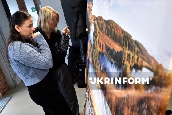 Відідувачки роздивляються експонати персональної фотовиставки вінницького фотографа Валентина Порохняка, що експонуються у турхабі Visit Vinnytsia, де відбулося урочисте спецпогашення нової поштової марки серії "Міста ідей" - "Вінниця наДихає. Пори року", світлини якого стали основою для нового ексклюзивного поштового блоку, Вінниця, 17 грудня 2025 року.