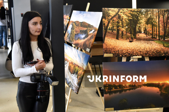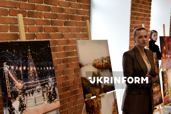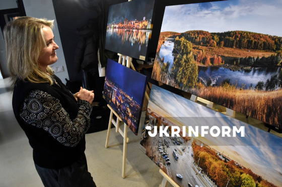 Відідувачка роздивляється експонати персональної фотовиставки вінницького фотографа Валентина Порохняка, що експонуються у турхабі Visit Vinnytsia, де відбулося урочисте спецпогашення нової поштової марки серії "Міста ідей" - "Вінниця наДихає. Пори року", світлини якого стали основою для нового ексклюзивного поштового блоку, Вінниця, 17 грудня 2025 року.