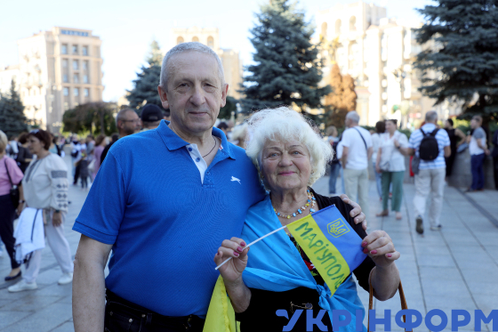 Чоловік і жінка позують для фото під час проведення Всеукраїнської акції "Маріуполь — шлях додому" під будівлею КМДА, Київ, 21 вересня 2025 року.