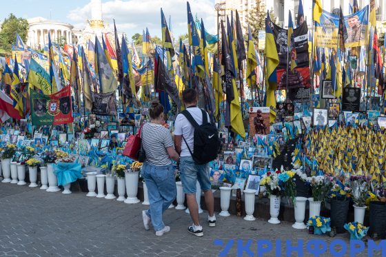 Люди біля імпровізованого меморіалу, де встановлено прапорці з іменами загиблих військовослужбовців, на Майдані Незалежності, Київ, Київ, 5 липня 2025 року.