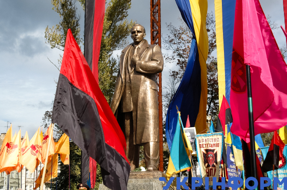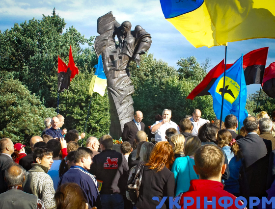 Урочиста церемонія відкриття першої частини комплексу пам’ятника провіднику Організації українських націоналістів (ОУН) Степанові Бандері в День українського козацтва та свята Покрови Пресвятої Богородиці, Львів, 14 жовтня 2007 року. Фото Володимира Песляка та Володимира Телюка.