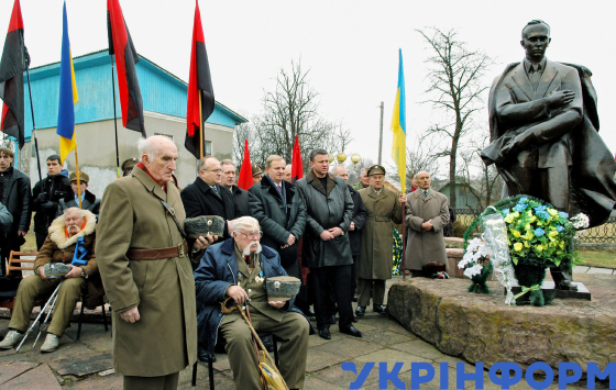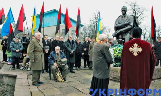 Учасники мітингу з нагоди 102-ї річниці від дня народження вшанували пам’ять провідника Організації українських націоналістів (ОУН) Степана Бандери біля пам’ятника на його батьківщині, село Старий Угринів, Івано-Франківська область, 1 січня 2011 року. Фото Юрія Рильчука.