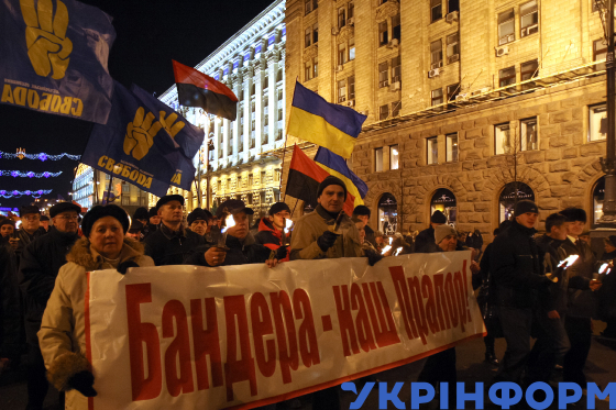 Учасники смолоскипної ходи під час акції "Степан Бандера – національний герой" із нагоди 100-річчя від дня народження провідника Організації українських націоналістів (ОУН) Степана Бандери на Хрещатику, Київ, 1 січня 2009 року. Фото Віталія Лазебника.
