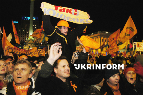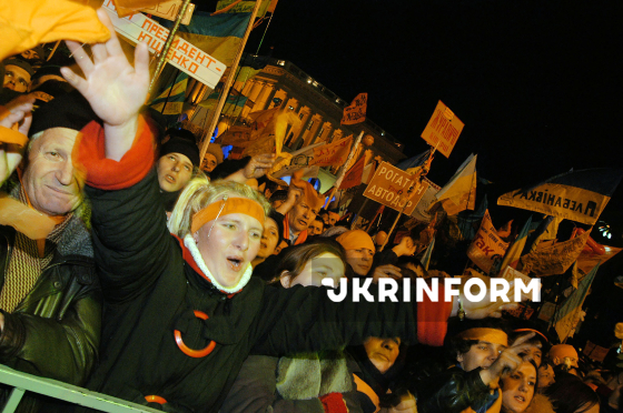 Учасники Помаранчевої революції в перші дні всеукраїнської мирної акції громадянської непокори на Майдані Незалежності висловлюють рішуче "так" чесним президентським виборам, Київ, 22 листопада 2005 року. Фото Володимира Тарасова.