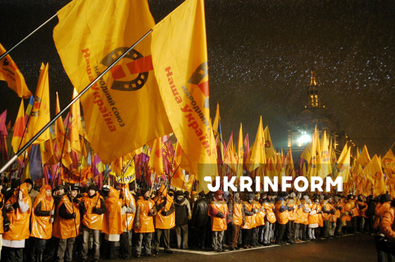 Тисячі киян і гостей столиці прибули на Майдан Незалежності на громадську інавгурацію переможця президентських виборчих перегонів Віктора Ющенка, який виступив на центральній площі міста зі зверненням до народу після офіційної інавгурації у Верховній Раді України, Київ, 23 січня 2005 року. Фото Юрія Рильчука.