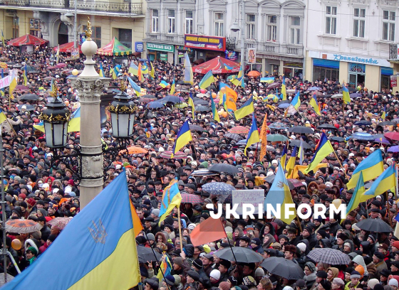 Тисячі львів’ян із державними та помаранчевими прапорами на Соборній площі підтримують акцію громадянської непокори після фальсифікацій результатів другого туру президентських виборів на користь провладного кандидата Віктора Януковича, Львів, 24 листопада 2004 року. Фото Володимира Песляка та Володимира Телюка.