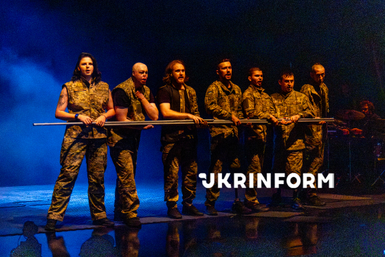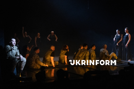 Актори Театру ветеранів (чинні військовослужбовці та ветерани російсько-української війни з ампутаціями та важкими пораненнями) грають ролі у експериментальній музично-пластичній виставі "Енеїда" під час її закритої прем’єри у Київському національному академічному Молодому театрі, Київ, 4 грудня 2025 року.
